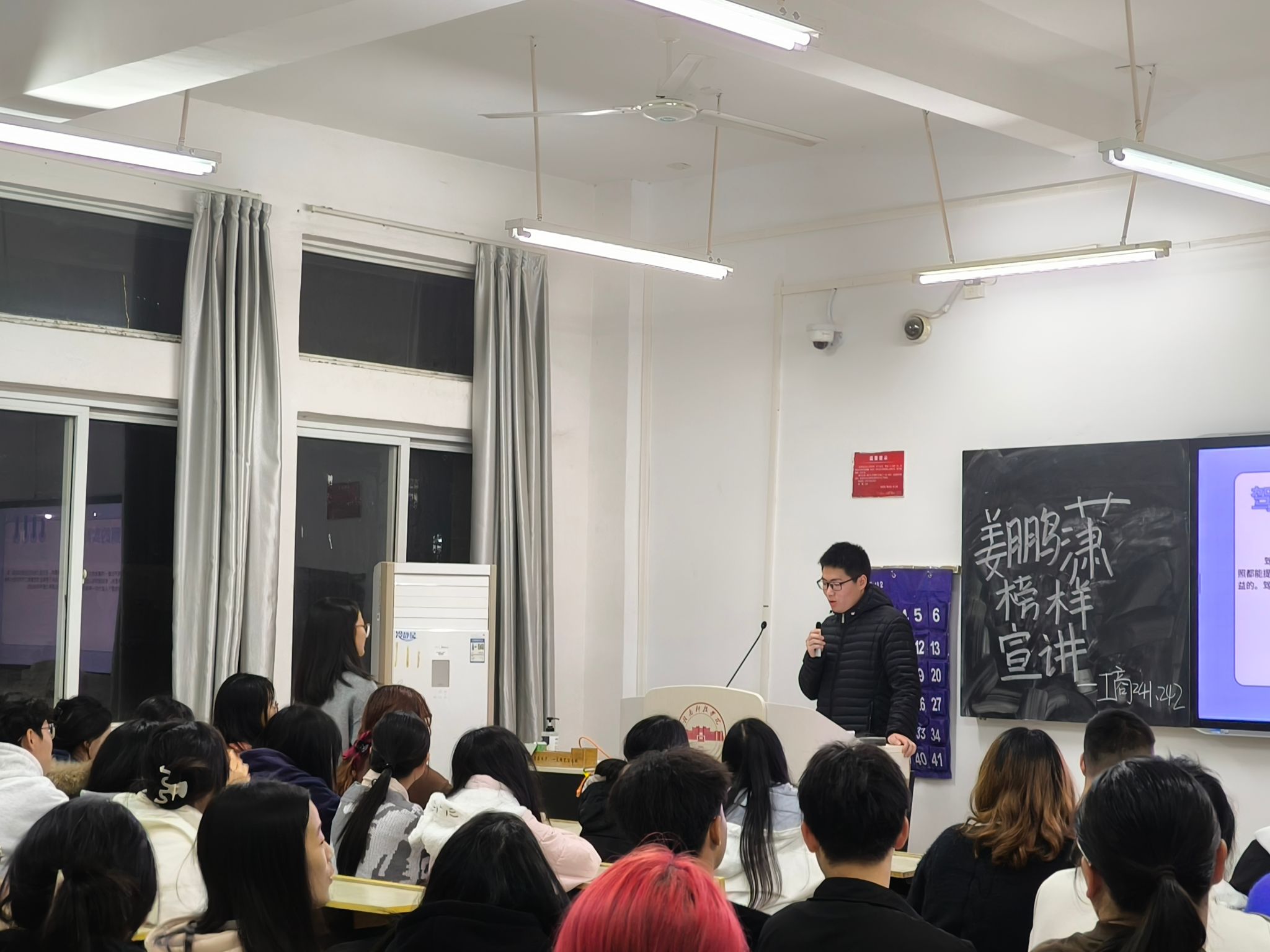 本网讯:为进一步激发同学们的学习热情,从优秀员工榜样中汲取力量,11月25日,伟德体育官方网站举办“榜样赣科”主题宣讲活动。本次活动邀请获得2024年国家奖学金的姜鹏潇同学为大家分享自己的学习经历与感悟,2024级工商管理专业全体员工参加。