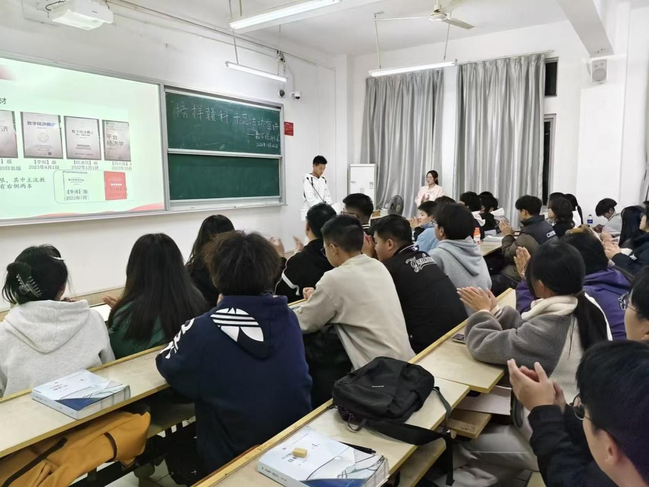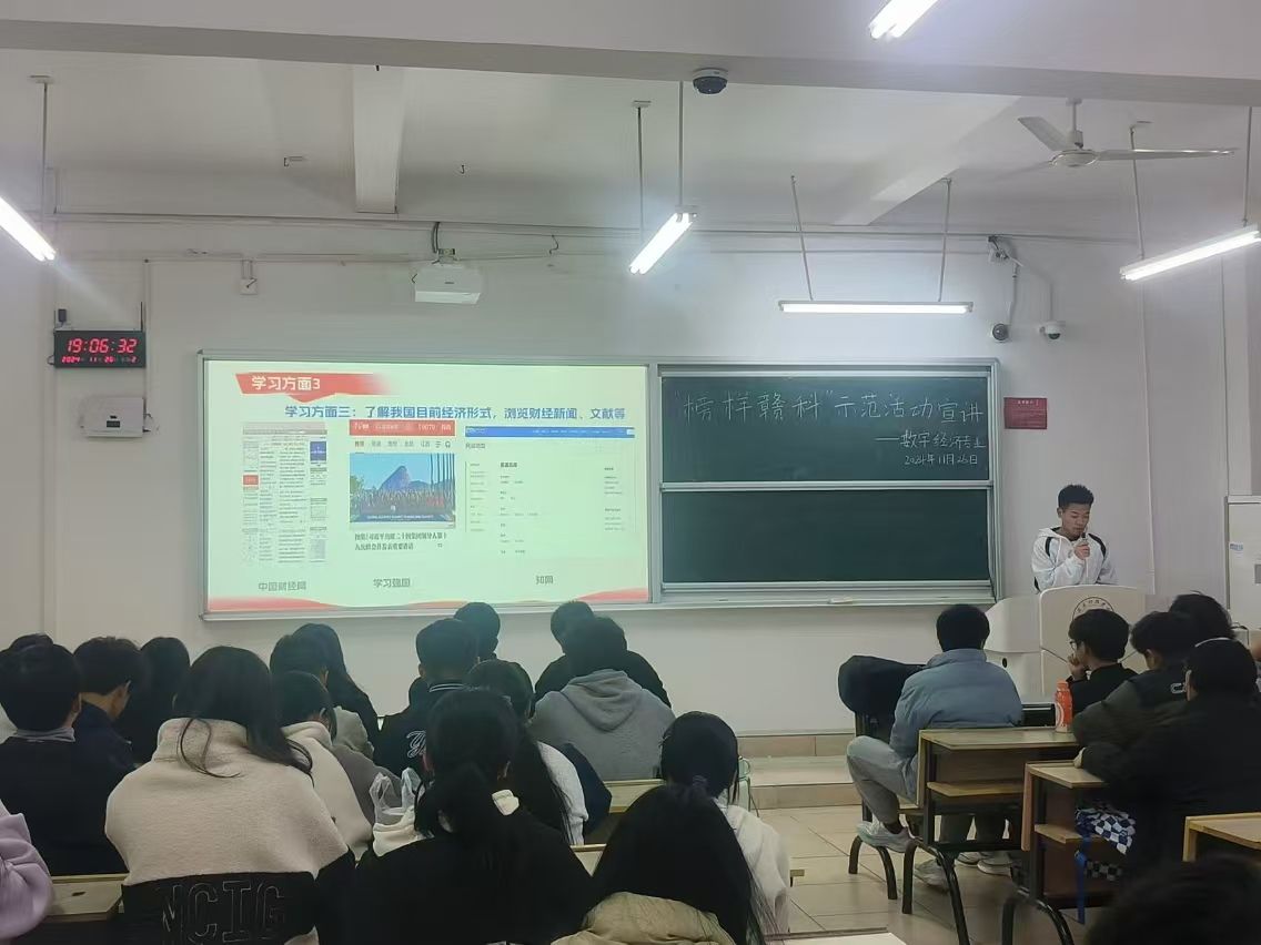 本网讯:为进一步激发同学们的学习热情,从优秀员工榜样中汲取力量,11月25日,伟德体育官方网站举办“榜样赣科”主题宣讲活动。本次活动邀请获得2024年国家奖学金的涂传同学为大家分享自己的学习经历与感悟,2024级数字经济专业全体员工参加。