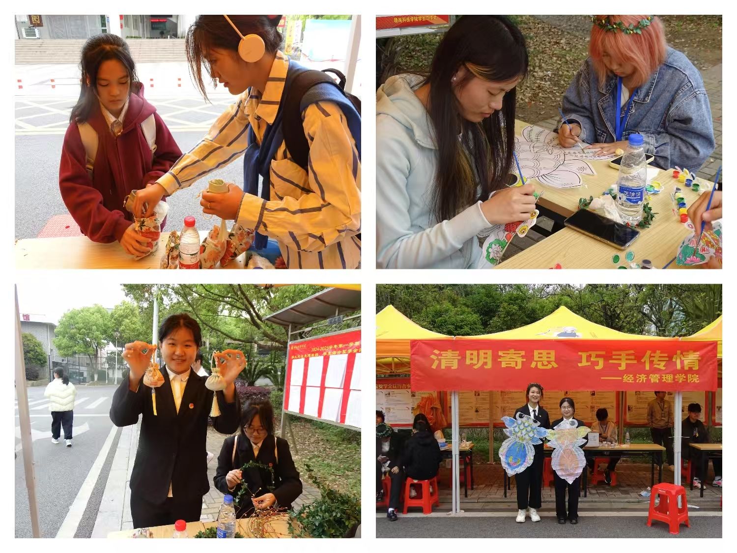 活动现场气氛热烈,在“香囊传情”区域,同学们边学边做,不时交流心得,一只只独一无二的香囊在她们手中诞生,散发着淡淡的药香;转至“纸鸢绘春”环节,同学们手执画笔,在纸鸢上自由挥洒,或细腻勾勒,或大胆泼墨,将春天的色彩与梦想绘于纸上;在“诗词接龙”的擂台上,同学们才思敏捷,一句句经典诗词脱口而出,现场掌声与欢笑声此起彼伏。此外,同学们在留言卡片上写下对英烈的崇高敬意与深切怀念,字字句句,情真意切;也有同学亲手编织柳条花圈,不仅寄托了美好愿望,更是一次对传统习俗的深刻体验与传承。
