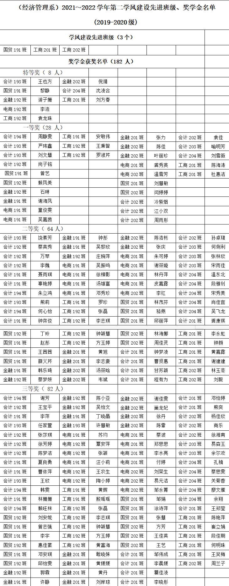 根据《伟德体育官方网站员工综合奖学金评定实施办法(试行)》《伟德体育官方网站学风建设先进班级评选办法(试行)》有关规定,按照院学工办《员工综合素质测评、综合奖学金评定及学风建设先进班级评选相关通知》要求,我系认真组织开展了2021-2022学年第二学期综合奖学金和学风建设先进班级评审工作。