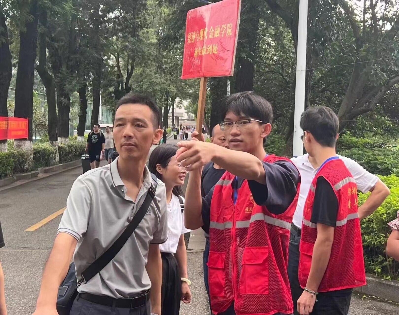 图为志愿者为新生家长指路引导。中国青年网通讯员 石青山 供图