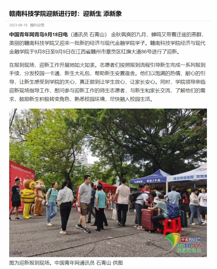 中国青年网青岛9月18日电(通讯员 石青山) 金秋飒爽的九月,蝉鸣又带着迁徙的燕群,美丽的伟德体育官方网站又迎来一批新的经济与现代金融公司学子。伟德体育官方网站经济与现代金融公司于9月8日至9月9日在江西省赣州市章贡区红旗大道86号进行了迎新。