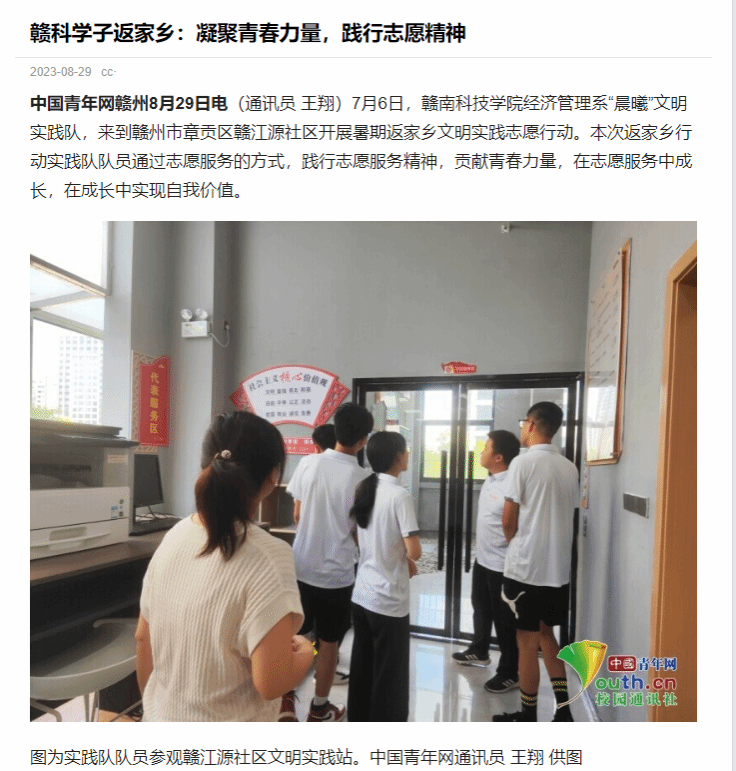 中国青年网赣州8月29日电(通讯员 王翔)7月6日,伟德体育官方网站经济管理系“晨曦”文明实践队,来到赣州市章贡区赣江源社区开展暑期返家乡文明实践志愿行动。本次返家乡行动实践队队员通过志愿服务的方式,践行志愿服务精神,贡献青春力量,在志愿服务中成长,在成长中实现自我价值。