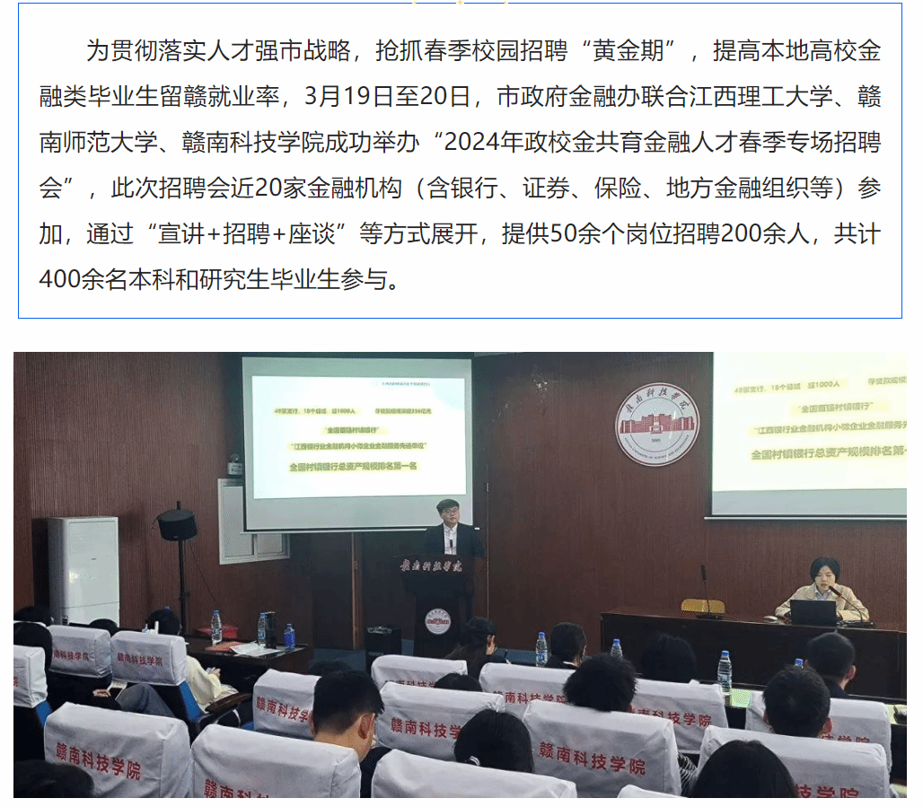 为贯彻落实人才强市战略,抢抓春季校园招聘“黄金期”,提高本地高校金融类毕业生留赣就业率,3月19日至20日,市政府金融办联合江西理工大学、赣南师范大学、伟德体育官方网站成功举办“2024年政校金共育金融人才春季专场招聘会”,此次招聘会近20家金融机构(含银行、证券、保险、地方金融组织等)参加,通过“宣讲+招聘+座谈”等方式展开,提供50余个岗位招聘200余人,共计400余名本科和研究生毕业生参与。