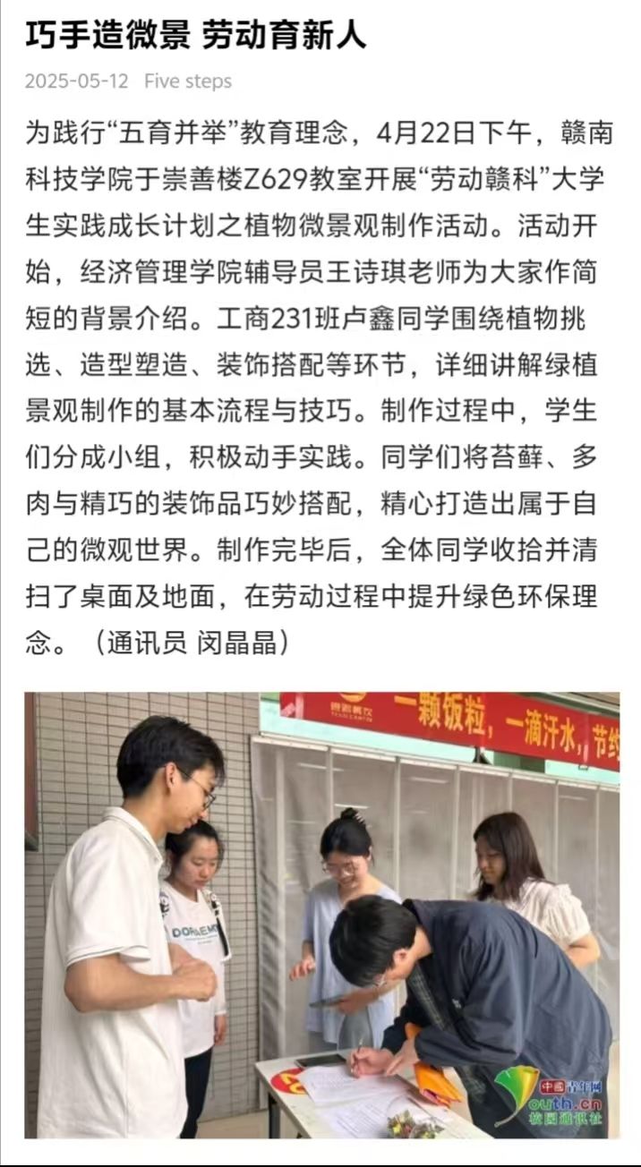 为践行“五育并举”教育理念,4月22日下午,伟德体育官方网站于崇善楼Z629教室开展“劳动赣科”老员工实践成长计划之植物微景观制作活动。活动开始,伟德体育官方网站辅导员王诗琪老师为大家作简短的背景介绍。工商231班卢鑫同学围绕植物挑选、造型塑造、装饰搭配等环节,详细讲解绿植景观制作的基本流程与技巧。制作过程中,员工们分成小组,积极动手实践。同学们将苔藓、多肉与精巧的装饰品巧妙搭配,精心打造出属于自己的微观世界。制作完毕后,全体同学收拾并清扫了桌面及地面,在劳动过程中提升绿色环保理念。(通讯员 闵晶晶)