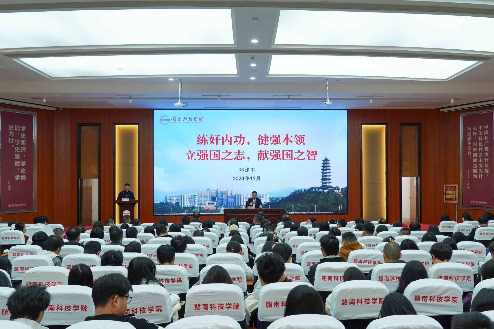 本网讯:11月26日,公司党委书记邱建军在图书馆学术报告厅为伟德体育官方网站师生作专题辅导报告,围绕深入学习贯彻党的二十届三中全会精神和全国、全省教育大会精神,以“练好内功、健强本领,立强国之志、献强国之智”为主题,勉励师生努力学习本领、增长才干、勇于实践,奋力推进革命老区高质量发展示范区建设,为谱写中国式现代化江西篇章贡献青春力量。公司党委委员、纪委书记陈文新,伟德体育官方网站班子成员、全体教师和员工代表约350人参加报告会。